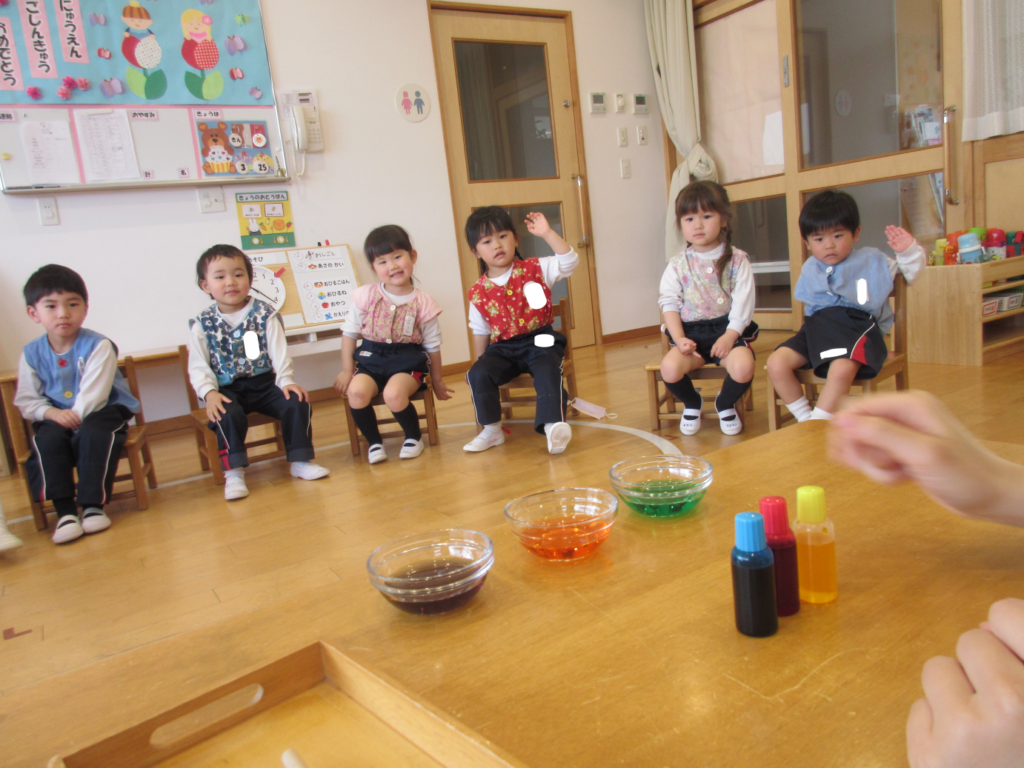 「赤と黄色をまぜると…みどりになるんじゃない?」「わー!オレンジだ!」と驚きと発見があったようです!