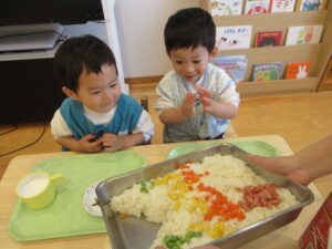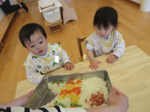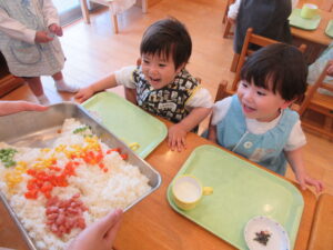 ばら組、ゆり組の給食はこいのぼりの形に盛り付けられたご飯がでました!