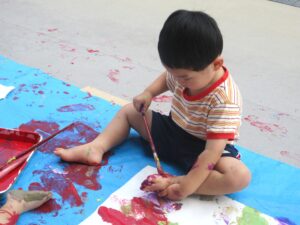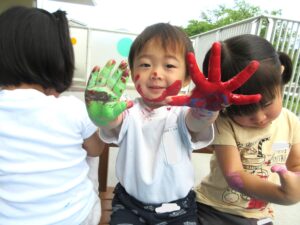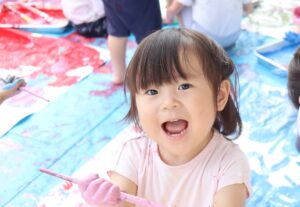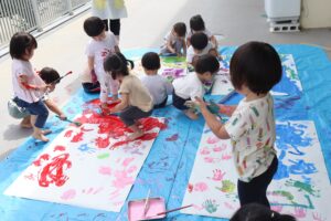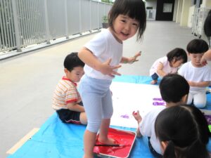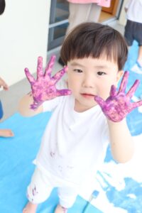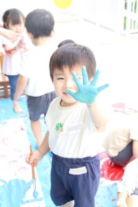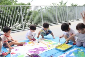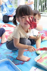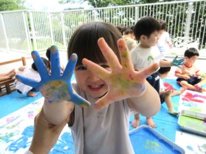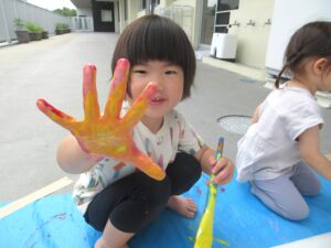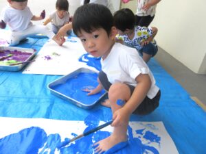 絵の具の冷たさや筆の感触、色が混ざっていく様子など、五感をたっぷり使って遊んだこども達。