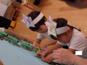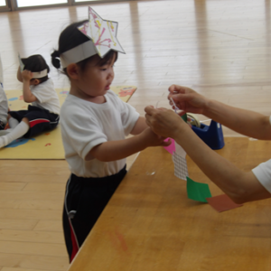 好きな色を選んで模様を付けた、星の頭飾りを頭につけて
