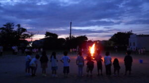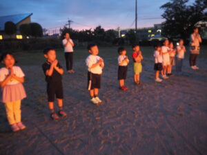 マリアひろばで火を囲んで『勇気音頭』と『キャンプだホイ』を踊り、『おやすみかみさま』を歌いました。