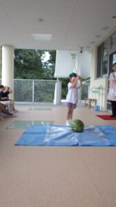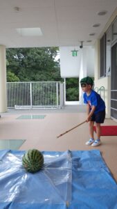 大きなすいかに興味深々の様子!すいかは割れるかな??