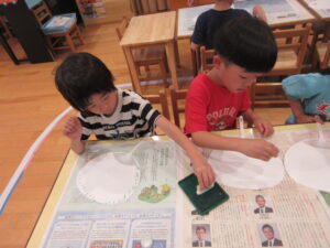 うちわづくりでは金魚やわかめなどのスタンプをおして、オリジナルのうちわが完成しました!