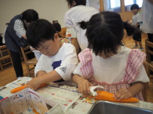 お家から持ってきた野菜を真剣な表情で切るこども達。