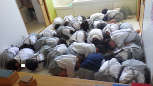 今日は、全園児で不審者侵入時の避難訓練を行いました。