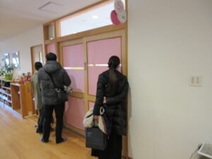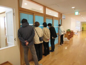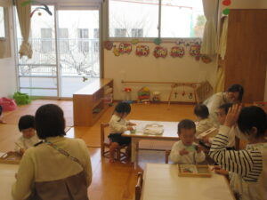 てんし組(0歳児)・ばら組(1歳児)は、朝の身支度やおしごと、お集まりなど普段から園で取り組んでいる活動を覗き窓から見ていただきました。