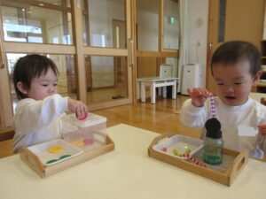 同じ「落とすおしごと」ですが、興味のあるものを選び夢中になっていて、隣でお友達がしているおしごとなど全く気にならないようです。