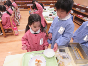 給食は自分で食べられる量を選んでゆっくり運びます。