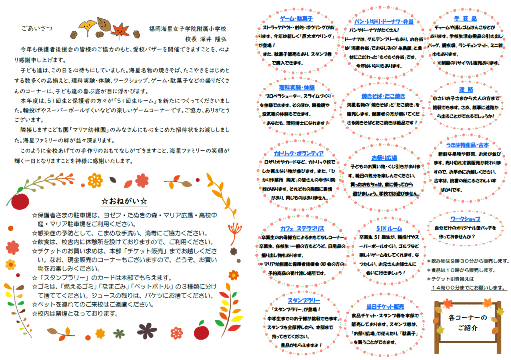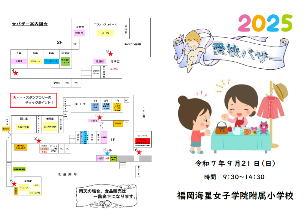 愛校バザーのご案内 2025.09.20 いよいよ明日、海星っ子が待ちに待った愛校バザーが開催されます。 保護者後援会役員の皆さまをはじめ、保護者、OB会の皆さまなどたくさんの方々のご尽力とご協力によって開催できることを感謝申し上げます。 当日はどうぞお気をつけてお越しくださいませ。 皆さまのご来校を心よりお待ちしております。