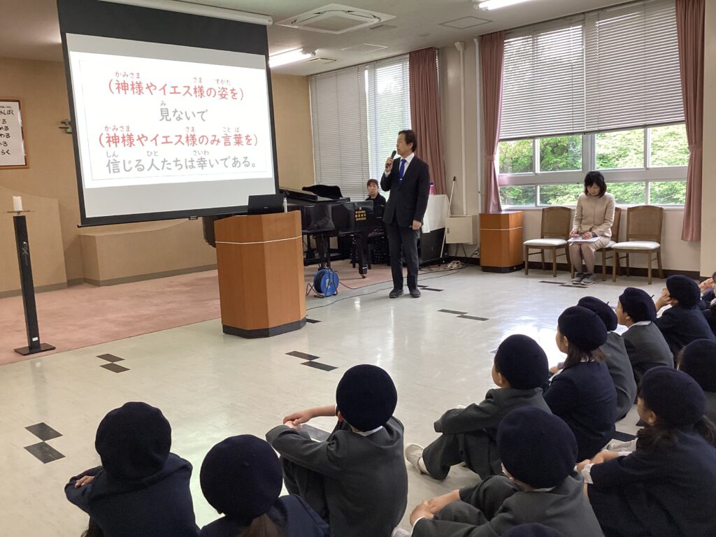 全校のつどい(4月20日) 2026.04.20 今日の全校集会は、校長先生から「信じる人たちは幸いである。」について「見たり聞いたりしたことの中には、うそや間違いもあります。自分で調べたり、話し合ったりして確かめることが大切です。何が大切なのか、どうしたらいいのか迷うことがあります。そいうときは、神様やイエス様のみことばを信じて行動することが大切です。」というお話がありました。