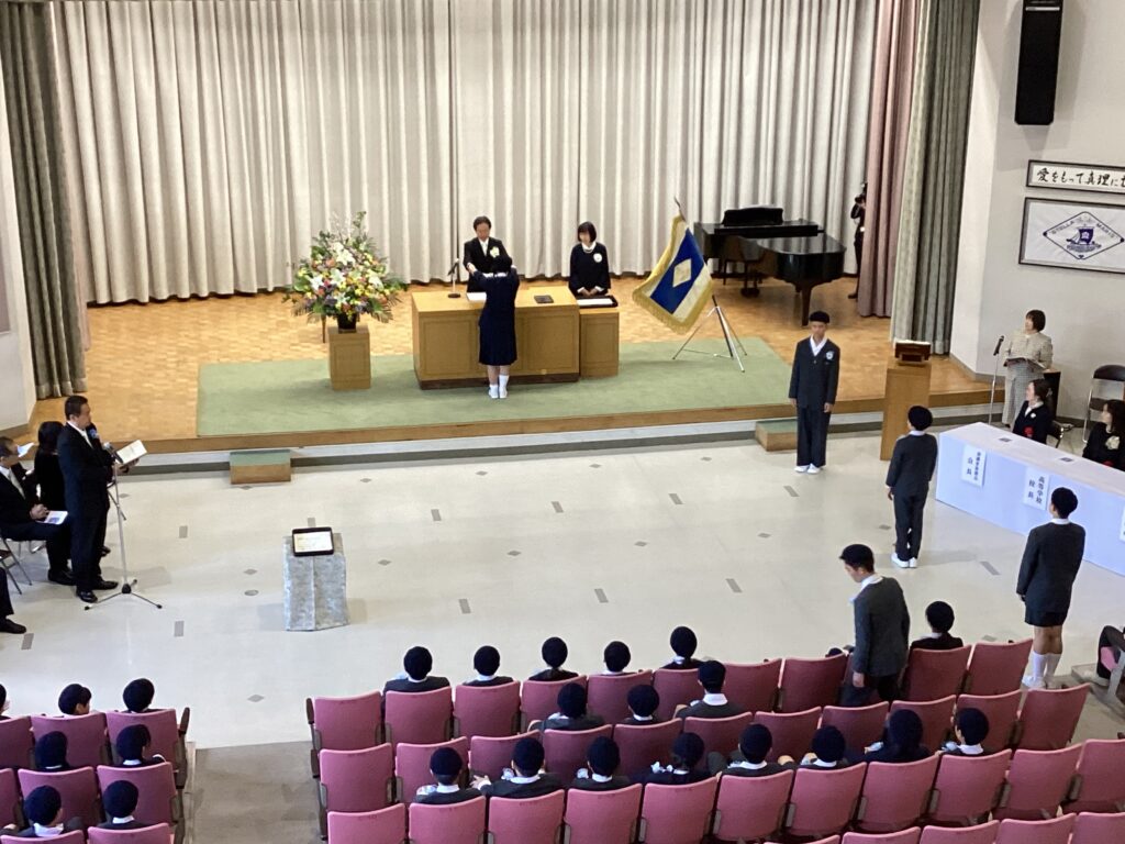 3月14日、午前10時から学院講堂において平成7年度 第53回卒業式が行われました。25名の卒業生(第53回生)が希望を胸に巣立っていきました。卒業式のはじめにお祈りを捧げました。「神さま、私たちは、きょう海星小学校を卒業できることを心から感謝いたします。私たちは、この六年間に、心も体もずい分成長しました。そして、知識だけでなく、人の生きる道についても、たくさん教えられました。これは、とても大きなお恵みでした。よいお友だちに助けられ、先生方の愛を体いっぱいに受けて、私たちはとても幸せでした。これからは、道がそれぞれ違っても、いつも神さまがついていてくださることを信じ、力強く生きていきます。そして、神さまが喜ばれることを進んで行う、心やさしい中学生になれるよう、がんばりたいと思います。」(抜粋)