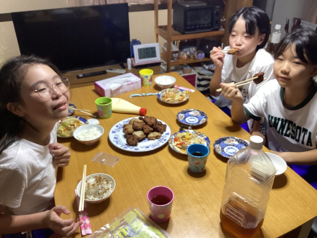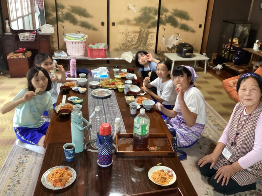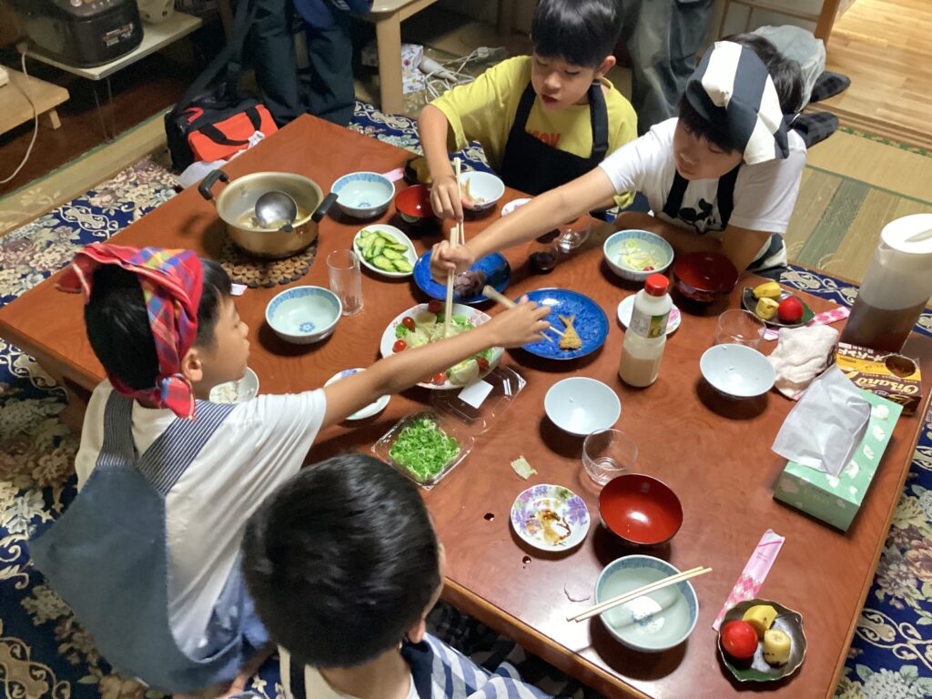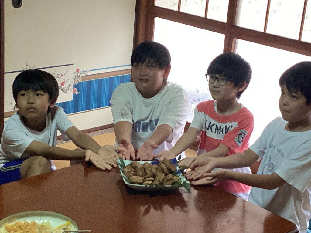 自然宿泊体験2日目② 「いただきます 。」(6月19日) 2025.06.19 インストラクターの方から習って、自分たちで調理したさつま(すりみ)揚げやアジフライをお昼ごはんでいただきました。おいしくて新鮮な青島のアジでつくった青島ならではの料理です。みんな満足そうにいただいていました。「ご馳走さまでした!」