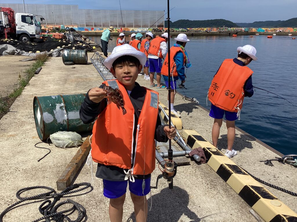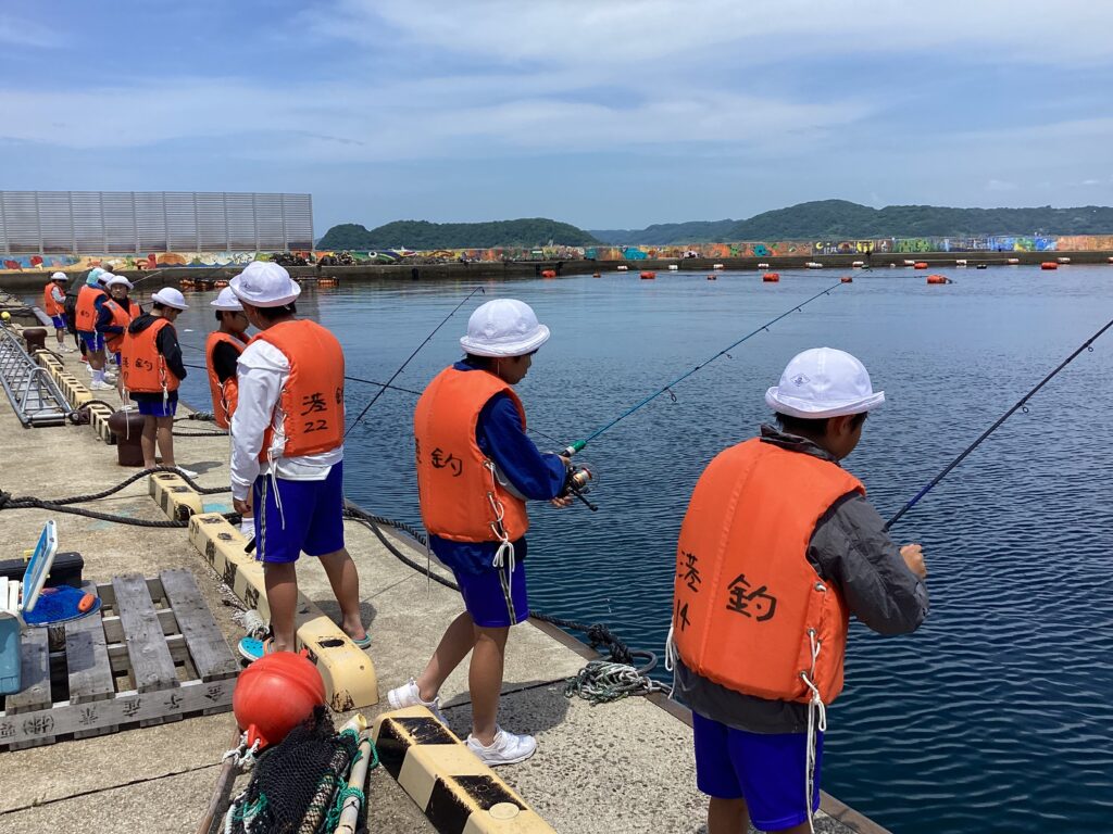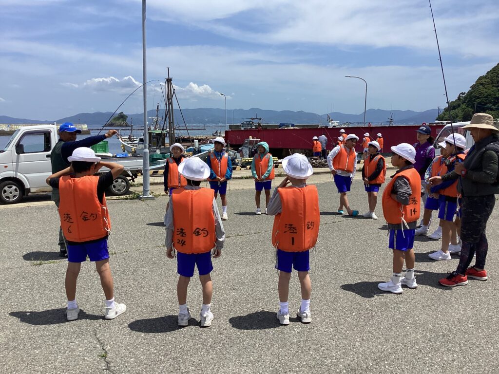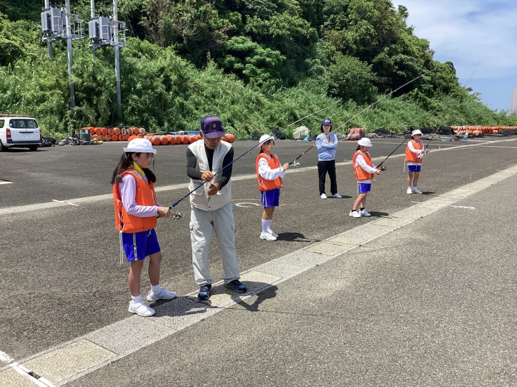 自然宿泊体験2日目③ 釣れました! (6月19日) 2025.06.19 港釣り体験が始まります。インストラクターの方から釣り方や注意を聴いています。 竿の使い方やエサの付け方を教えてもらいました。 エサを準備してもらいます。 釣れるかな。 エサの付け方も教えてもらいました。 釣れたぞー‼︎‼︎