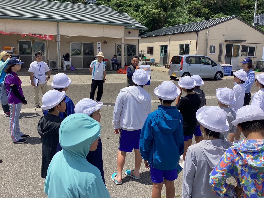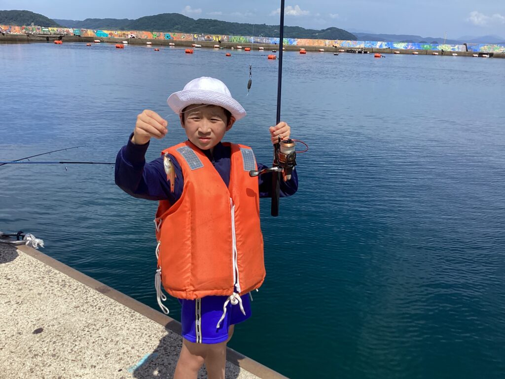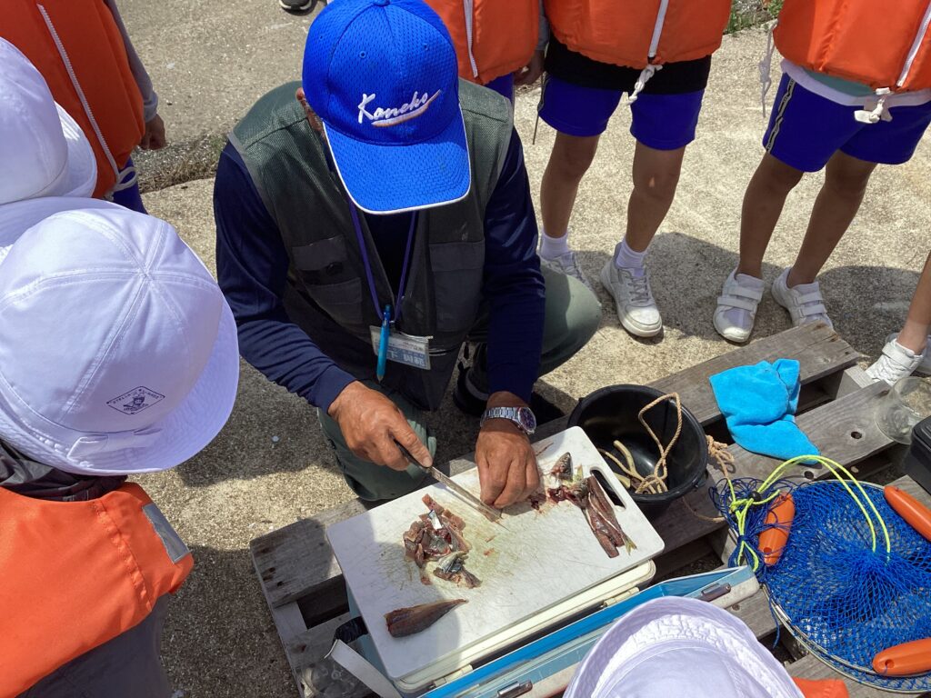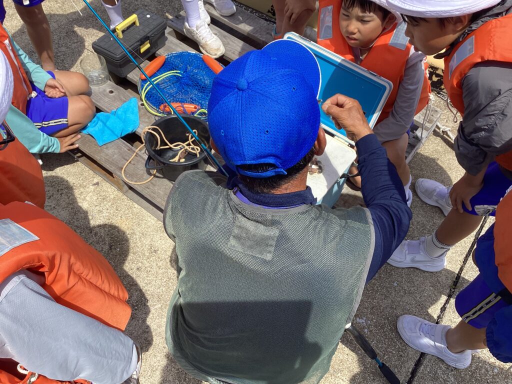 自然宿泊体験2日目③ 釣れました! (6月19日) 2025.06.19 港釣り体験が始まります。インストラクターの方から釣り方や注意を聴いています。 竿の使い方やエサの付け方を教えてもらいました。 エサを準備してもらいます。 釣れるかな。 エサの付け方も教えてもらいました。 釣れたぞー‼︎‼︎