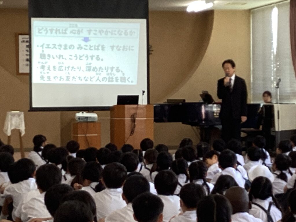 令和7年8月25日(月曜日) 今日から2学期が始まりました。始業式で校長先生が、今日のみことば「目(心)が健やかであれば、全身が明るい。しかし、目(心)をわずらえば体は闇となる。」についてお話をされました。どうすれば心が健やかになるか。1つは、イエスさまのみことばを素直に聴き入れ行動すること。もう1つは、考えを広げたり、深めたりする、先生やお友だちなど人の話を聴くこと。このことができるように2学期がんばりましょうとお話がありました。