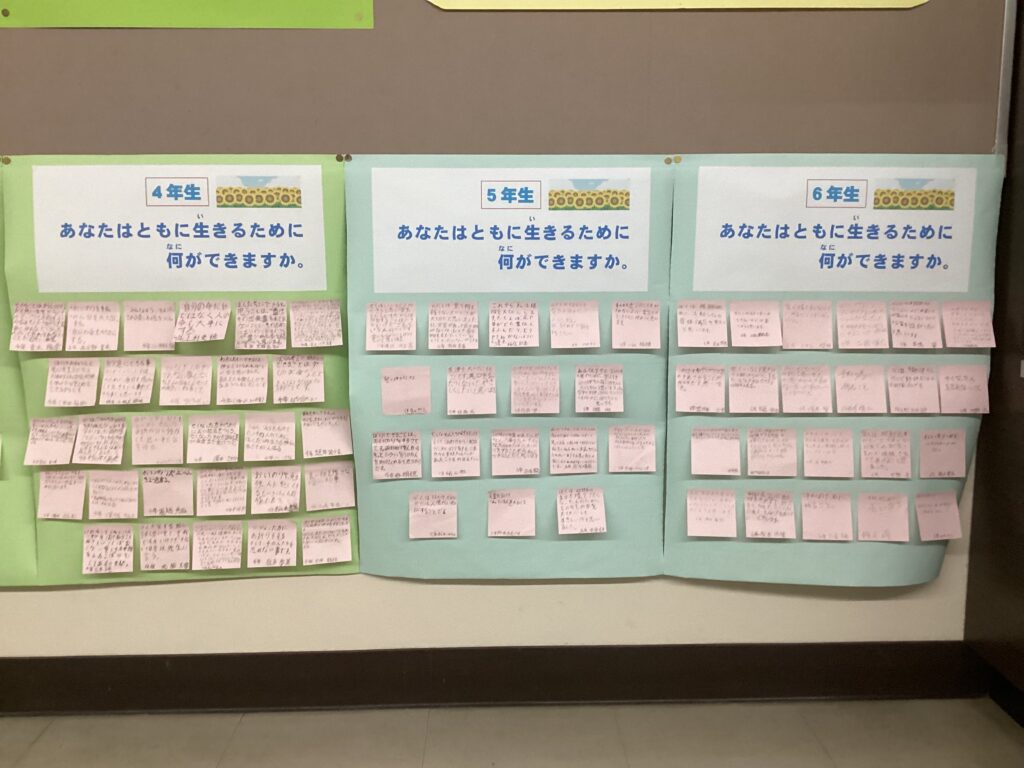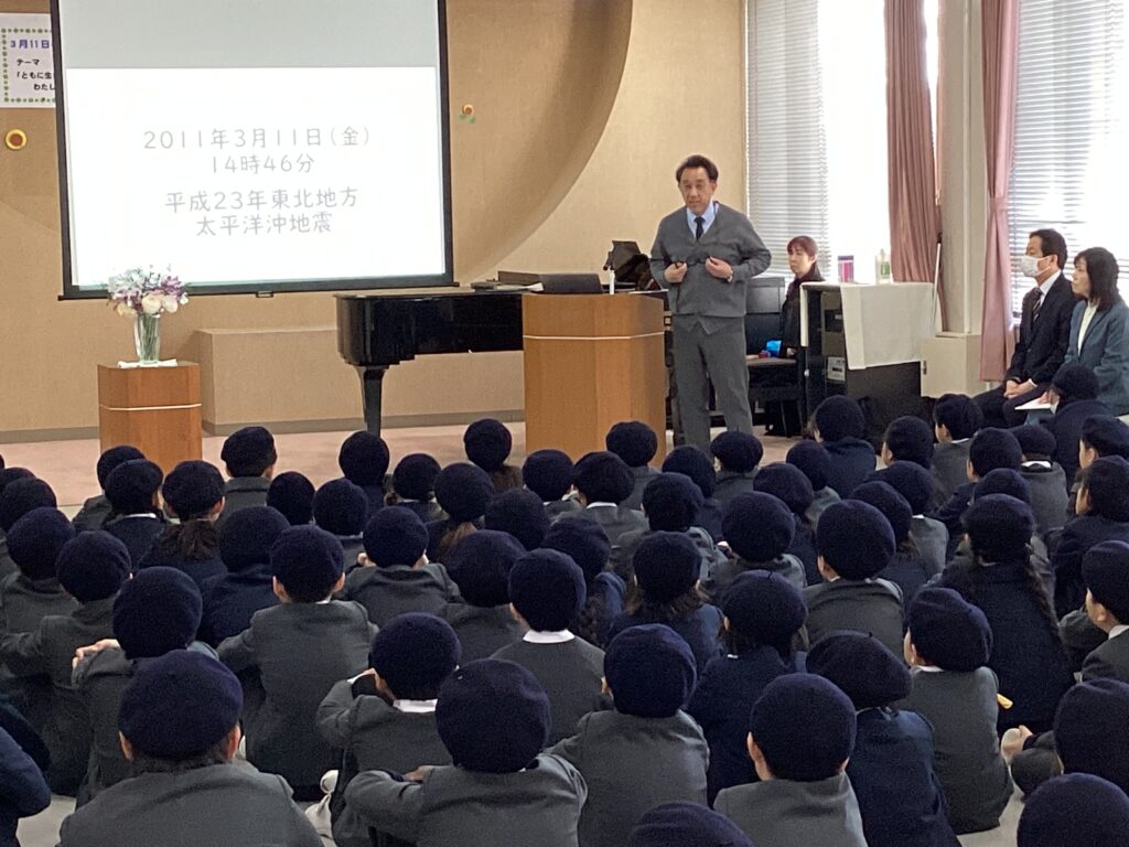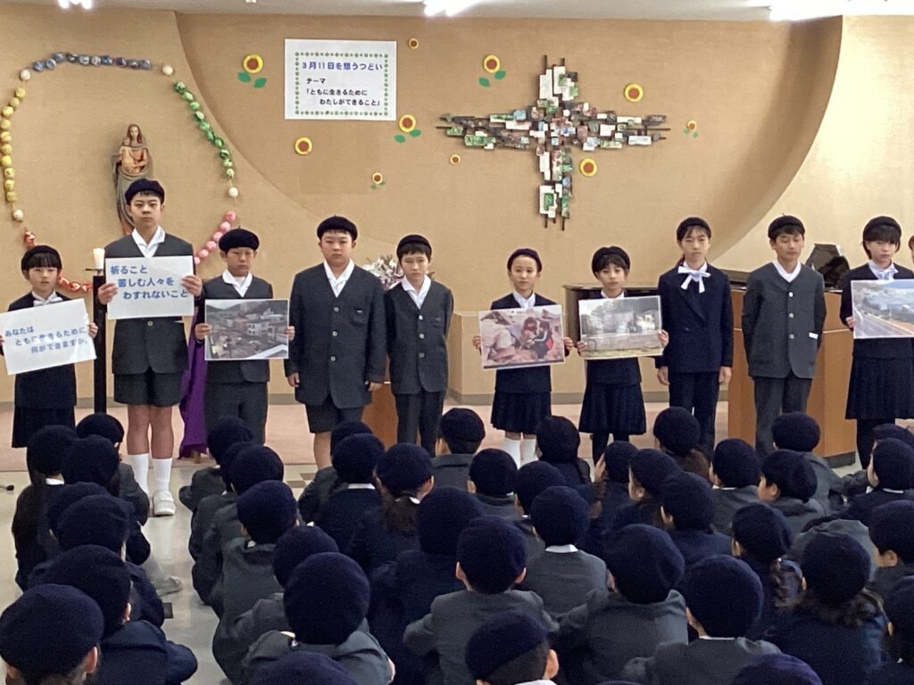 3月9日、東日本大震災で亡くなられた方々の追悼をするつどいが開かれました。つどいでは、宗教委員会が東日本大震災のことを想う呼びかけをしました。そのあと、教頭先生から当時の様子と「これから、私たちができることを考えることが大切です。」というお話がありました。海星小学校では、2月24日から毎日朝の学級の時間にノベナを行い、亡くなられた方々や被災した方々を想い「聖母マリアの祈り」をお祈りしてきました。つどいのあと各学級で、この地球上で生かされている私たちが、病気の方、被災された方、弱い立場にある方たちのことを忘れず、「ともに生きるために、わたしができること」をテーマに考えを書きました。書いたものをマリアロビーに掲示しました。