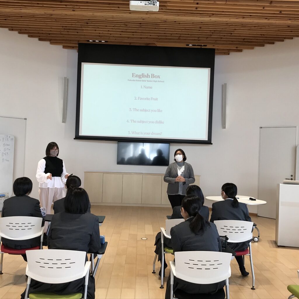 今日から、English Box(少人数英会話レッスン)が、すべてのコースの生徒を対象に始まりました。全コースから英語が大好きな生徒がたくさん集まり,新1年生のおよそ半数が受講しています。 写真は、ネイティブスピーカーの先生ジャズメン先生とノーリン先生のティームティーチング、充実の英会話レッスンです。笑顔の絶えない、楽しい英会話の時間。目標は、全員英検2級以上合格。