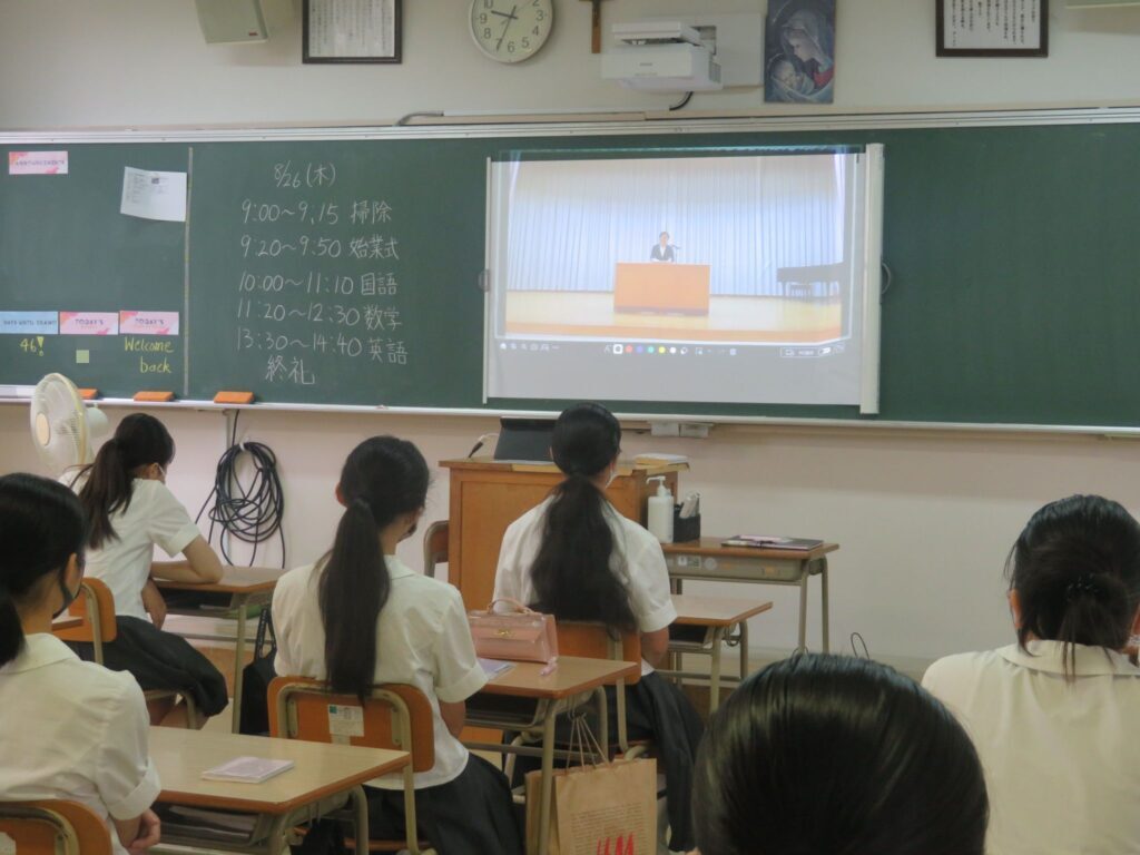 二学期が始まりました。 8月26日(木)から二学期が始まりました。最初に新しい2人の先生の紹介がありました。その後、二学期の始業式がありました。生徒たちは各教室でリモートで校長先生の式辞に熱心に耳を傾けました。 これから生徒たちがスムーズにいつもの学校生活に戻れることを期待しています。 メッセージは下のリンクをクリックしてください。 第2学期 始業式 2021.08.27 前の記事へ 一覧 次の記事へ