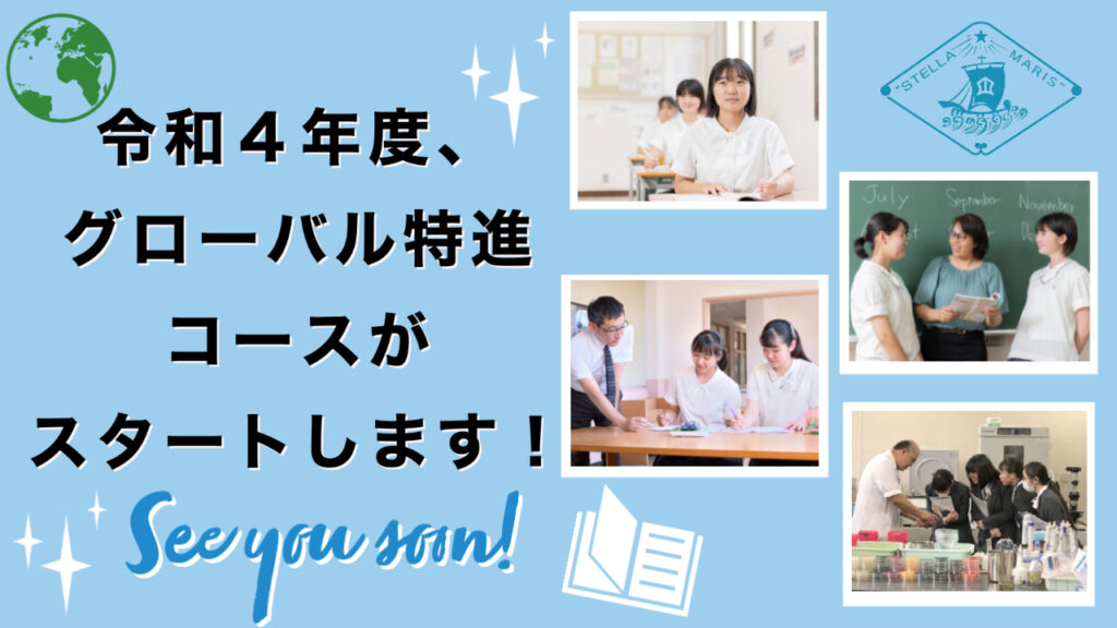 海星には、4つのコースがあります。今日から一つずつ、ホームページを通して、ご紹介します。まず最初に、令和4年度4月、これまでの特進コースがリニューアルし、「グローバル特進コース」が誕生します。難関私立大学や国公立大学への現役合格、世界にはばたく人材の育成を目指します。