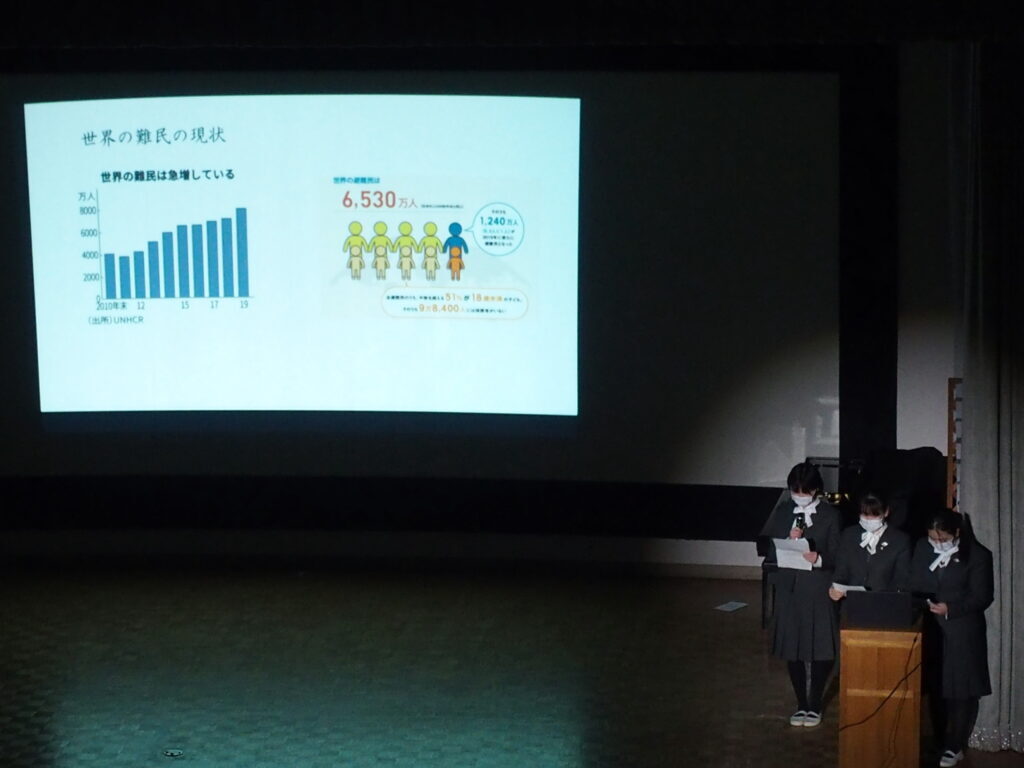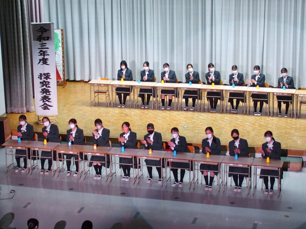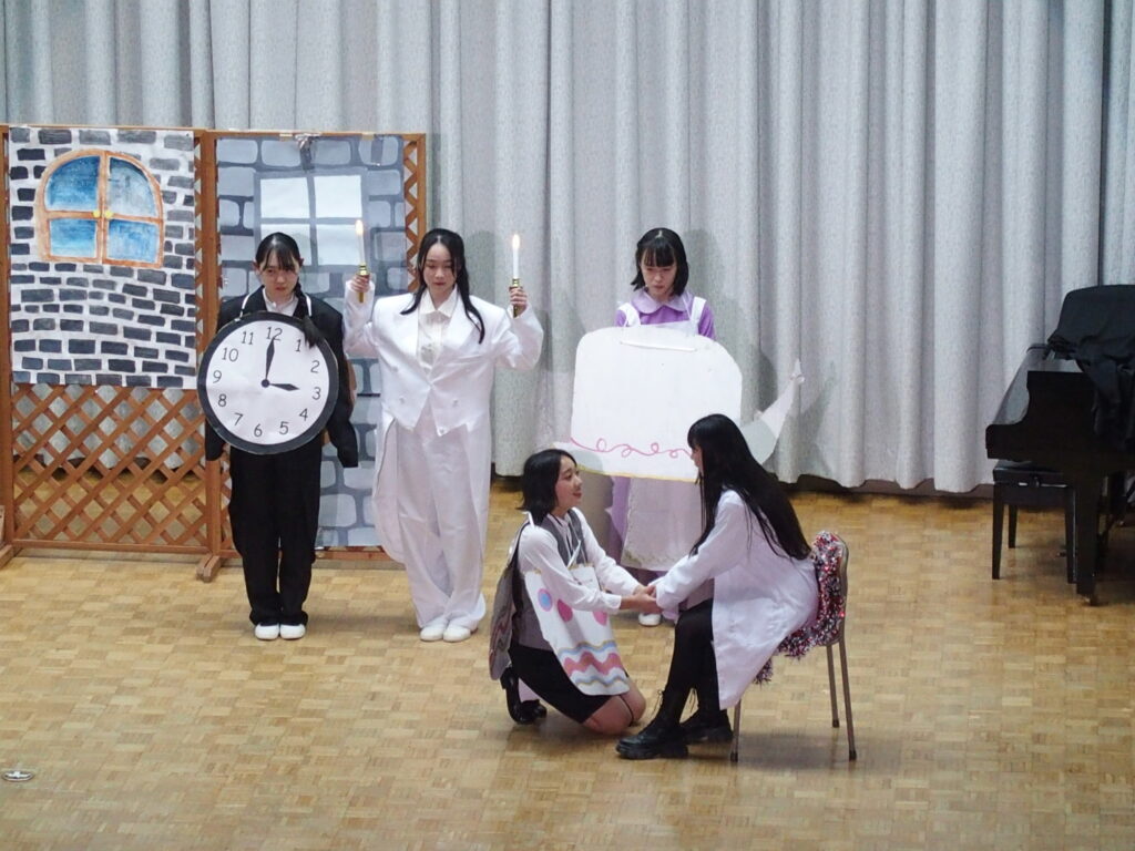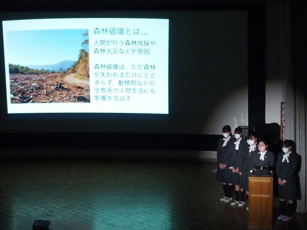 ガイアの時間(総合的な探究の時間)で学んだことを披露する機会をもちました。まず、2年生、こども教育進学コースによるボディーパーカッション、次に、1,2年生、各コースの代表者がSDGS探究と、ゴールに到達するために必要な手立てや、それを解決するための方法について各グループが研究したものを発表しました。最後に、国際教養1年生による40分間のすばらしいドラマの演技が披露されました。すべて英語で、今年度は、「美女と野獣」を演じました。どの発表も1年間の学習の成果を存分に発揮し、大変見ごたえのある内容でした。みなさん、お疲れさまでした。