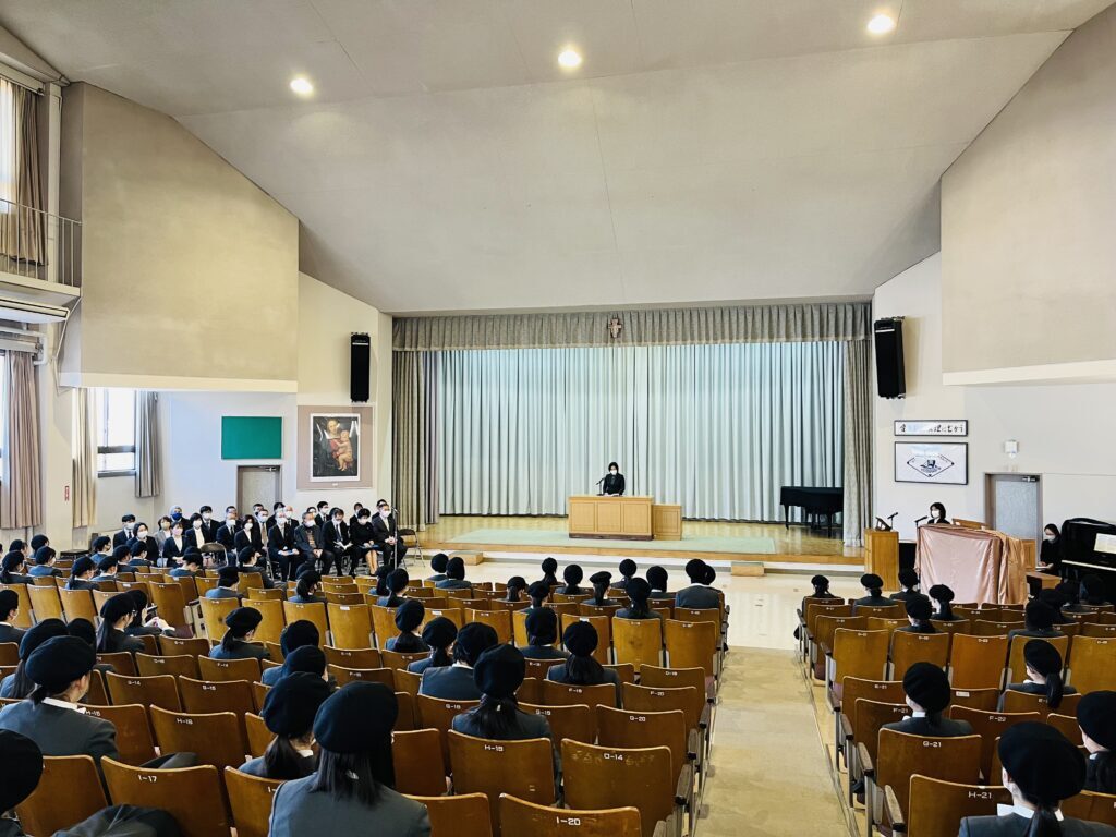 修了式 3月16日、お天気に恵まれ、暖かい春の日でした。私たちは無事修了式を迎えることができました。 学校長の式辞と共に、1年間の学びを振り返りました。生徒たちは、4月からあらたな学年に進級します。生徒の皆さん、保護者の皆様、よき春休みをお迎え下さい。4月にお会いできるのを楽しみにしております。 学校長の式辞はこちらからご覧いただけます。 令和3年度修了式 「祈り」校長 古賀誠子 2022.03.17 前の記事へ 一覧 次の記事へ