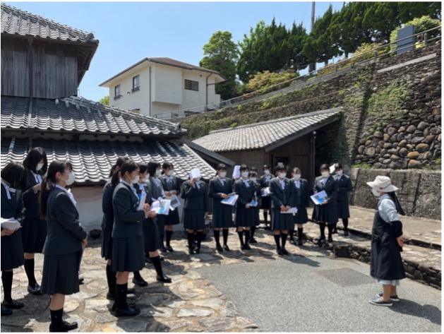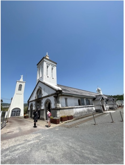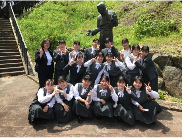 1年生は4月28日(木)に実施された長崎への「平和の旅」を楽しみました。今回の旅のハイライトは、長崎市西出津町にある出津教会の訪問でした。教会からは五島の海を眺めることができました。この教会は1882年ドロ神父の尽力により建立されましたものです。ドロ神父はこの地の女性たちが自立した生活ができるように、手助けをすることに全力を尽くされました。この教会の中で目を閉じると、平和な気持ちになり、1年生全員で世界平和を祈りました。生徒たちは、キリスト教の歴史を学ぶことができ、とても印象深い旅となりました。家族や友人とそこで学んだことを共有したいと思います。