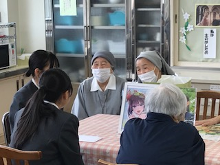海星の生徒は、シスター方の日頃のお祈りに対して感謝の言葉を述べ、校歌を披露しました。手作りの60個のクリップや、2C結城朱理さんが描いた記念の絵をプレゼントしたところ、たいへん喜ばれました。この訪問は、生徒たちのみならず、教員にとっても、大きなお恵みであり、改めて海星の生徒・職員としての誇りを確認できたひとときになりました。