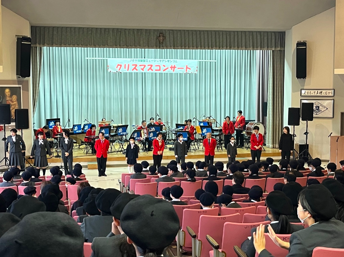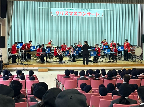 11月30日に、福岡海星女子学院付属小学校との合同イベントとして、JOY俱楽部クリスマスコンサートが行われました。障害福祉サービス事業所JOY俱楽部の音楽活動グループ「ミュージックアンサンブル」による笑顔あふれるステージは、ピュアで温かく、私たちは心から感動しました。素晴らしい演奏やダンスに出会えたことに感謝し、メンバーの皆さんに再会できることを楽しみにしています。本当にありがとうございました。