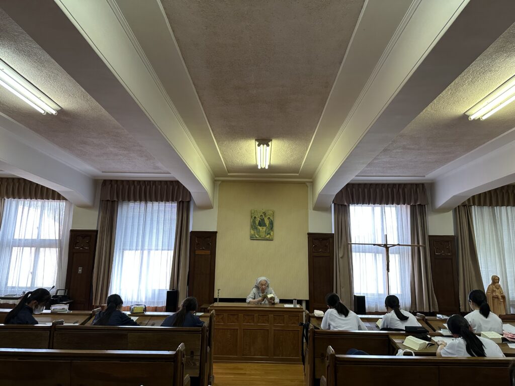 シスター入江より講堂朝礼で全校生徒にお話をいただいた後、ブライトコースの生徒たちと一緒に神学院に行っていただきました。