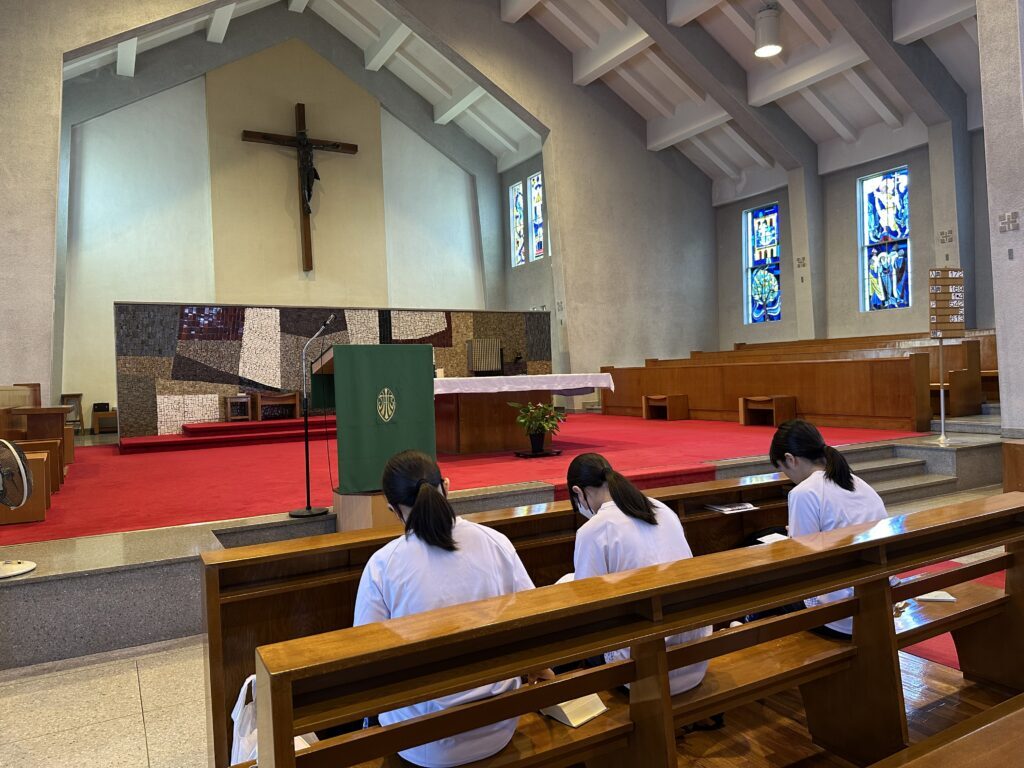 海星のスクールモットーは「地の塩、世の光」。今日の聖書の箇所を思い巡らせながら、聖歌《われらは地の塩、世の光》を歌いました。