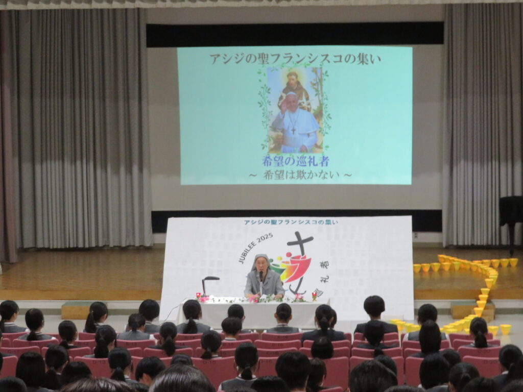 「シスターからお話を伺い、希望を持って、心からお祈りすることはとても大事なことだと分かりました。今日ほど祈りの大切さを重く感じたことはありませんでした。自分の今や、これからについて考える時間となりました。そして自分だけでなく、友達や家族、他者を幸せにできるような人、希望の巡礼者になっていきたいと感じた集いでした。」(ある生徒の感想から)