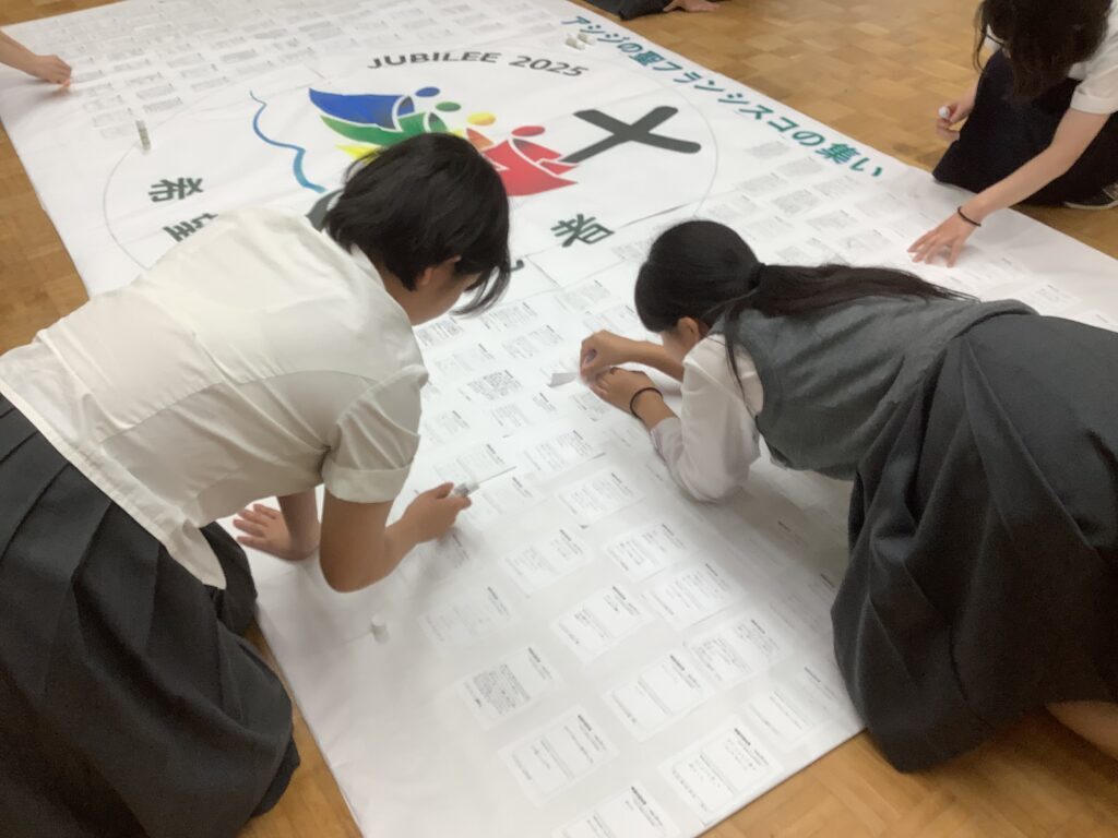 テーマは「希望の巡礼者 ~希望は欺かない~」。「希望の巡礼者」のロゴマークの周りに生徒達のお祈りを集め、集いの中で奉納しました。