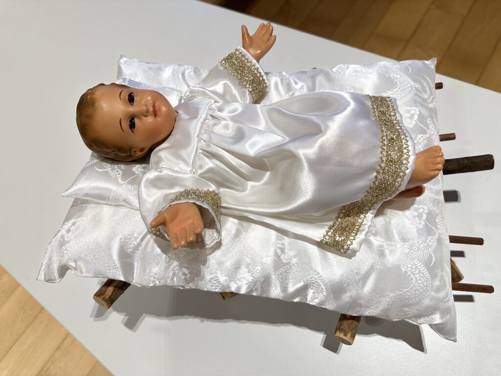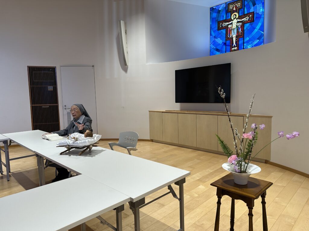分かち合いの後には、一人ずつ幼きイエス様を近くで見て、抱かせていただきました。イエス様の洋服や布団等もシスター方の手作りです。イエス様は一番小さな者として、私たちのためにお生まれになりました。