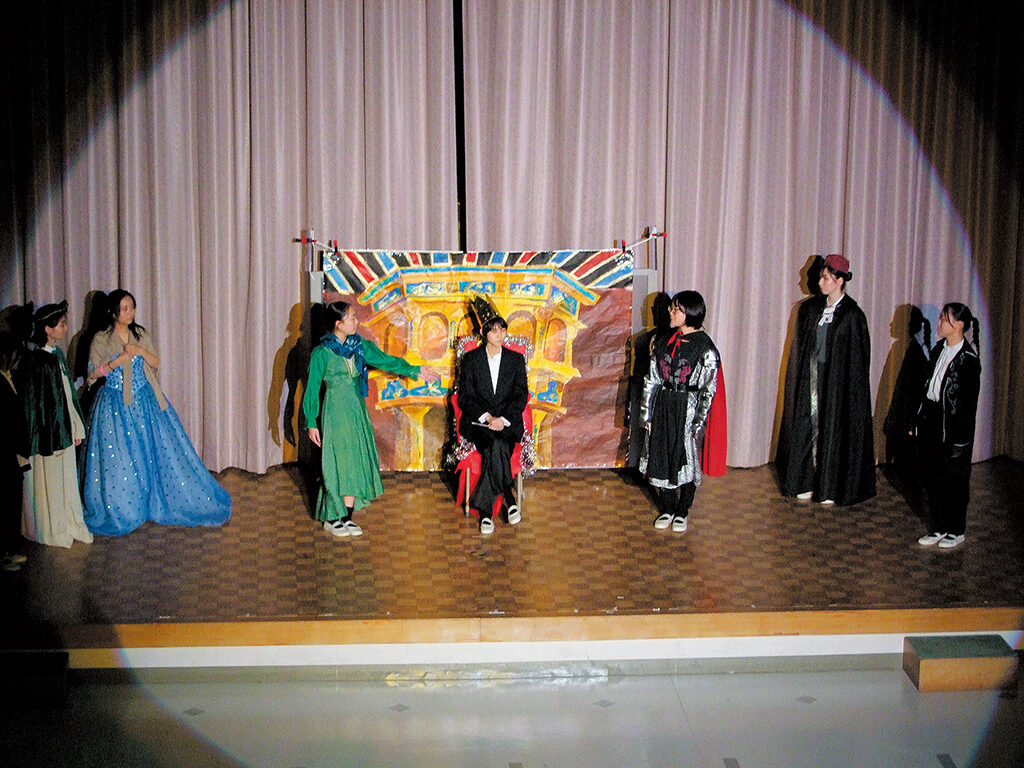 「ドラマ」は国際教養コース独自の授業で、顔の表情や身振り手振りを使って体全体で英語を表現します。令和5年度は「ジャンヌ・ダルク」を全校生徒の前で披露しました。