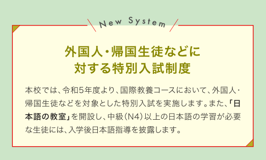 令和5年度より、国際教養コースにおいて、外国人・帰国生徒などを対象とした特別入試を実施しています。また、「日本語教室」を開設し、入学後日本語の学習が必要な生徒には、日本語指導を行います。