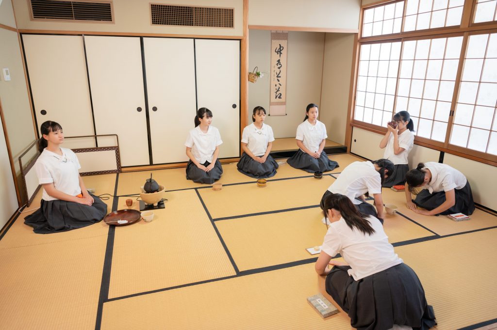 礼法の授業では、茶道・華道といった日本の伝統文化を学ぶこと通して、立ち居振る舞いや言葉遣いなどを身に付けます。さらに資格取得を通しておもてなしの心とかたちを育てます。