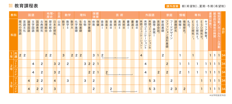 「リード」では、生物と数学Ⅱが必修となり、医療・看護系や食物栄養系にも対応することが可能です。「ワイド」では、情報探究や課題研究を通して自分にあった進路を模索します。「こども教育」では保育に関する基礎知識を学び、将来の幼稚園・小学校教諭、保育士免許取得に有利となる技術を習得します。