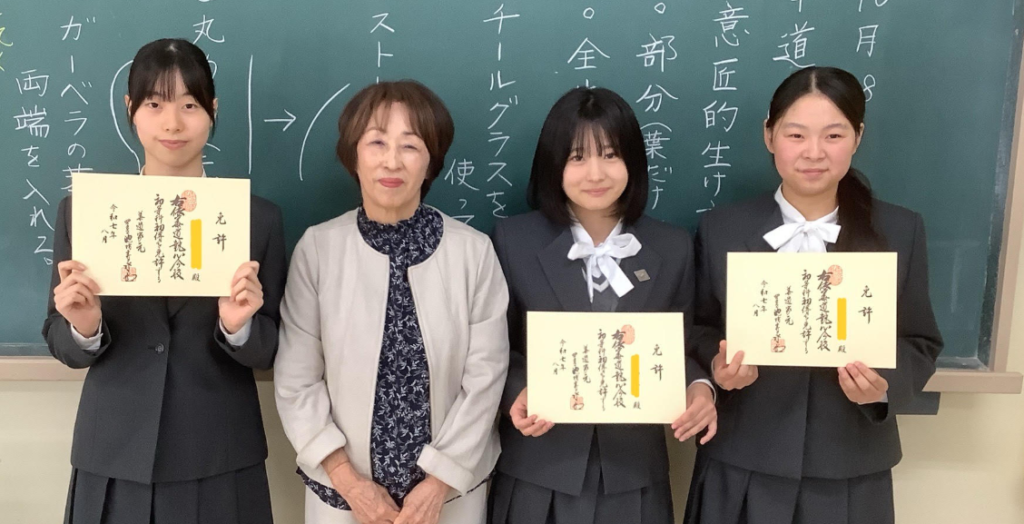 先日、華道の授業を修了した生徒が免許状(華道家元池坊 初伝)をいただきました。