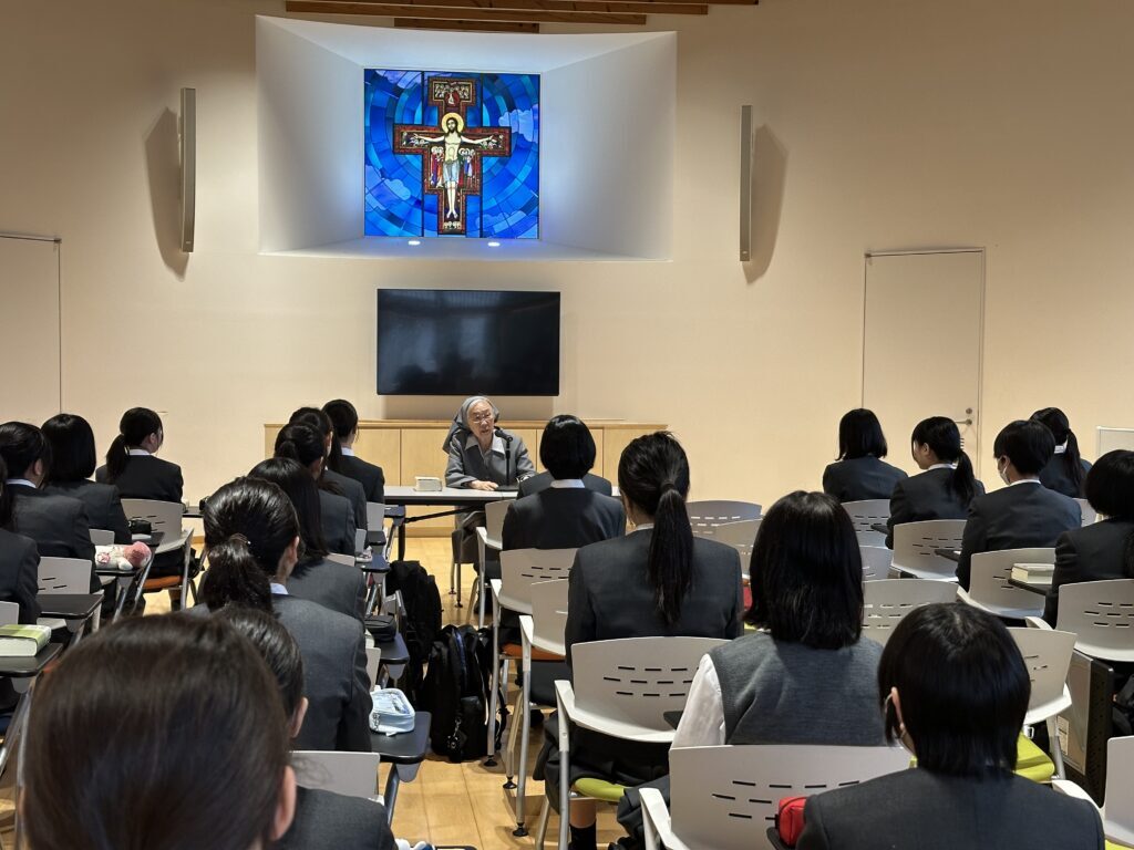 講堂朝礼で全校生徒へのご講話の後、入学して間もないブライトコースの1年生のためにシスター入江がお話をしてくださいました。初めて聖書を開く1年生です。今日は「創世記」第1章を読み、天地創造について知りました。神様に祝福され、この上なく愛されて造られたわたしです。自分を大事にできるからこそ人も大事にすることができること、また今まで自分一人で生きてきたのではなく大きな力に助けられ、何かの力に生かされてきたことを知りました。