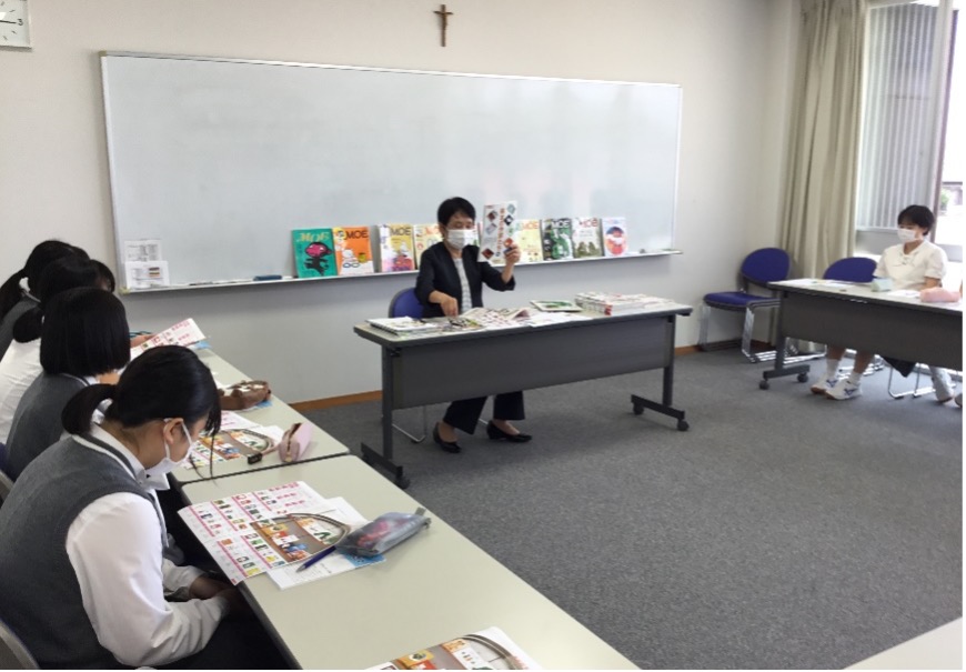 こども教育進学コースでは、絵本や読み聞かせについて知るために、1年生で絵本講座を行っています。今年度は、マリア幼稚園の野口園長に絵本について教えていただきました。