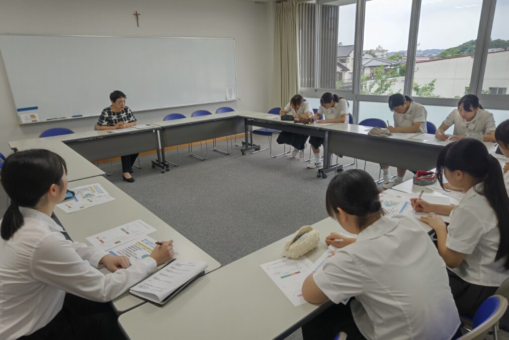 こども教育進学コースの1年生が附属園を訪れ、園見学を行いました。マリア幼稚園では一人ひとりの子どもを適切に援助することができるように、また安心安全に過ごせるように配慮されています。園長先生よりマリア幼稚園の環境作りについてお話をお聞きします。