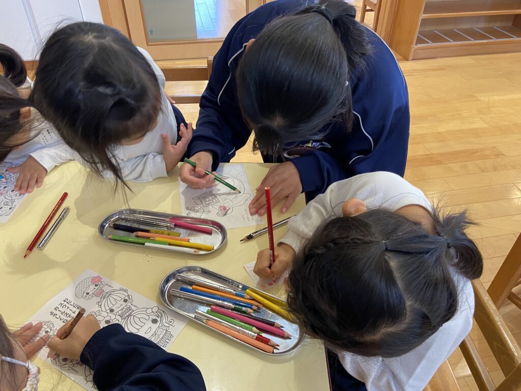 1年こども教育進学コース「附属園実習」 こども教育進学コースの1年生が附属園で実習をしています。 こども達の前で絵本の読み聞かせ 塗り絵「はみ出さないようね!」 折り紙「よく見ていてね!」 手遊び「一緒にやってみよう!」 2021.11.03 前の記事へ 一覧 次の記事へ