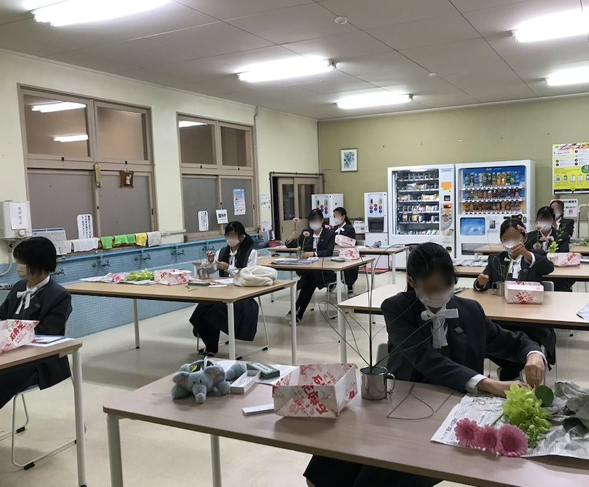 国際教養コースの1年生は、今週の授業が今年度の最後の文化理解の授業となった。華道の生徒たちは、ガーベラやデンファーレを使い、オアシスに花をいけて、それを家に持ち帰った。華道の生徒の3名は先生から華道の免許状を受け取ることになっている。