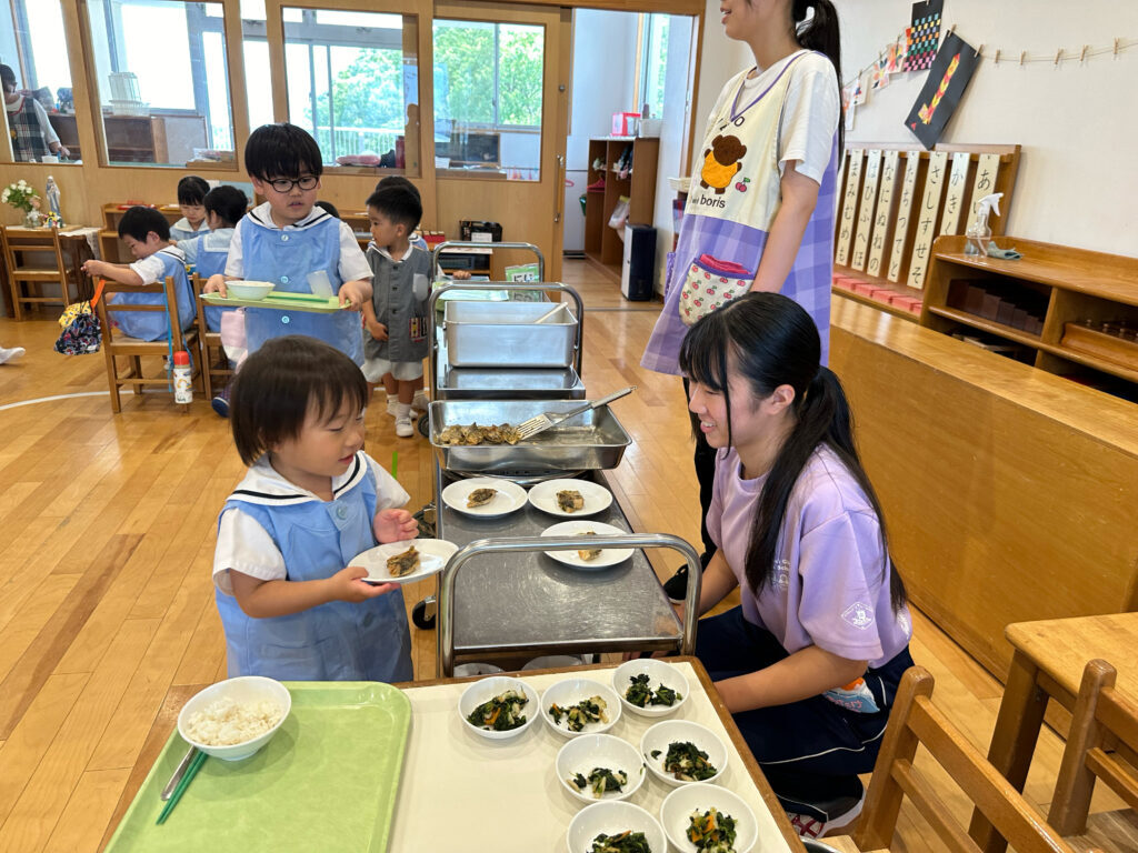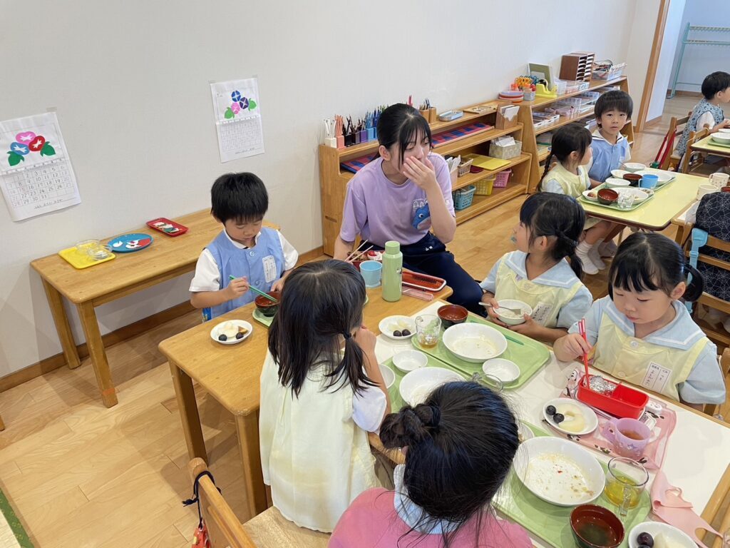 子ども達と一緒に楽しくお話をしながらお食事をいただきます。
