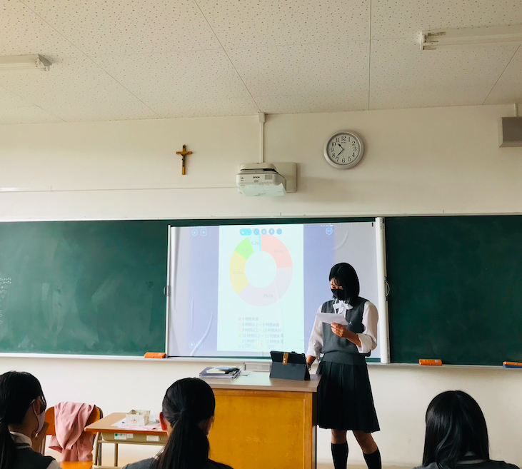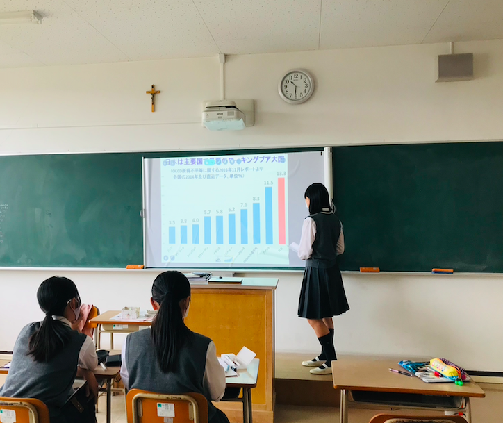Students in the second-grade International Liberal Arts Course did presentations about their investigations regarding the working conditions in Japan. Students discovered that overtime work in Japan was high compared to other countries. The second-grade class concluded that more actions by the government were required to reduce the working hours, in particular overtime work. It has been exciting studying this social issue, and we hope to make more people aware of the different social problems we are facing!