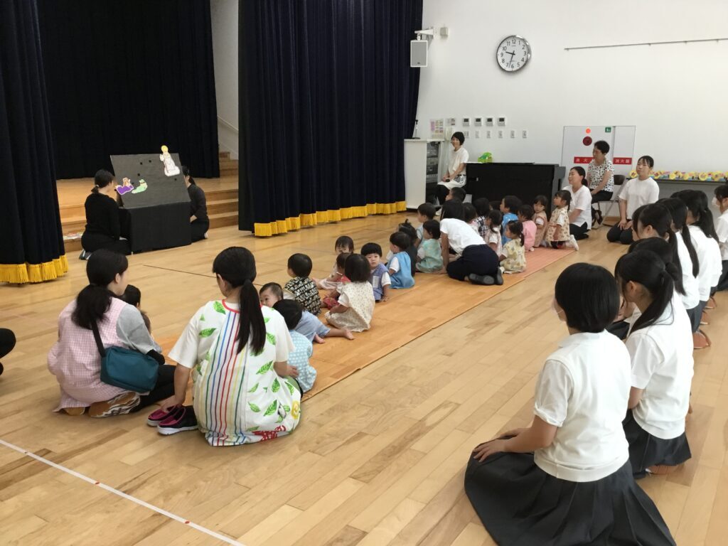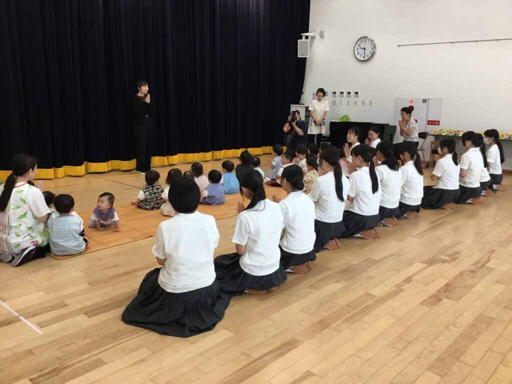 同じキャンパス内にある認定こども園マリア幼稚園の未満児さんのクラス「七夕会」の行事補助にこども教育進学コースの3年生が入らせていただきました。未満児さんの行事補助に入るのは、「節分の集い」以来です。行事前から子ども達に会えることを楽しみにしていた3年生です。