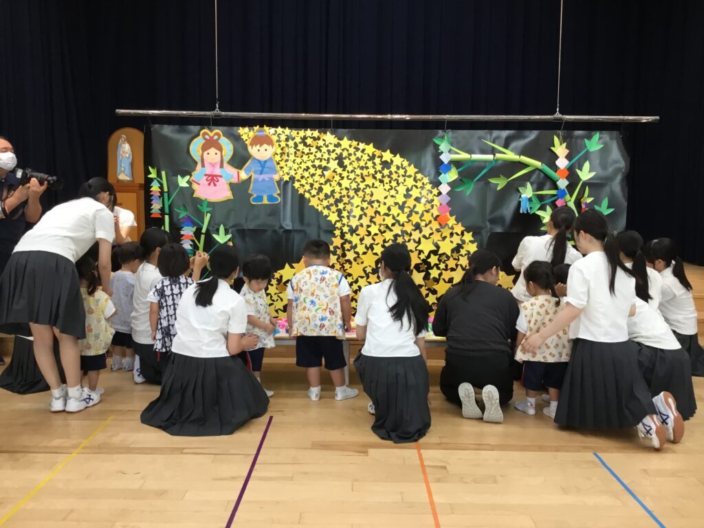 聖歌を歌い、お祈りをして「七夕会」をはじめました。