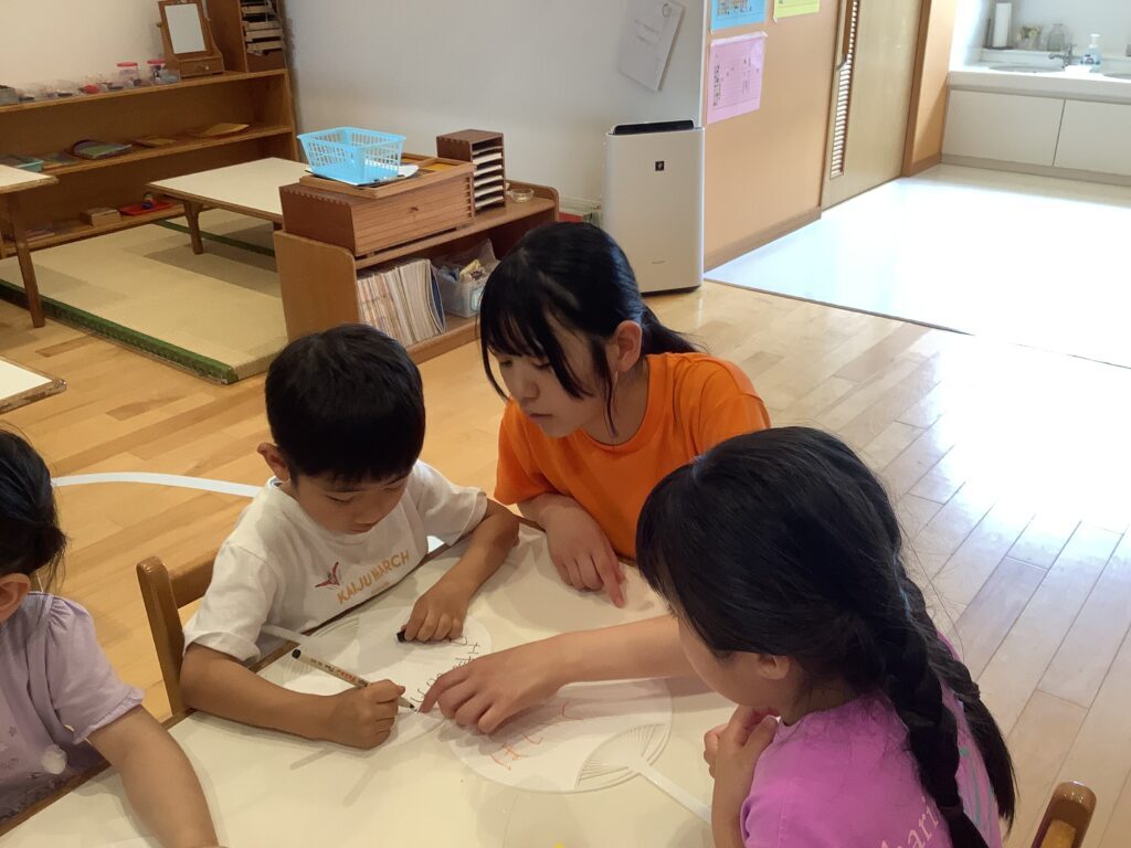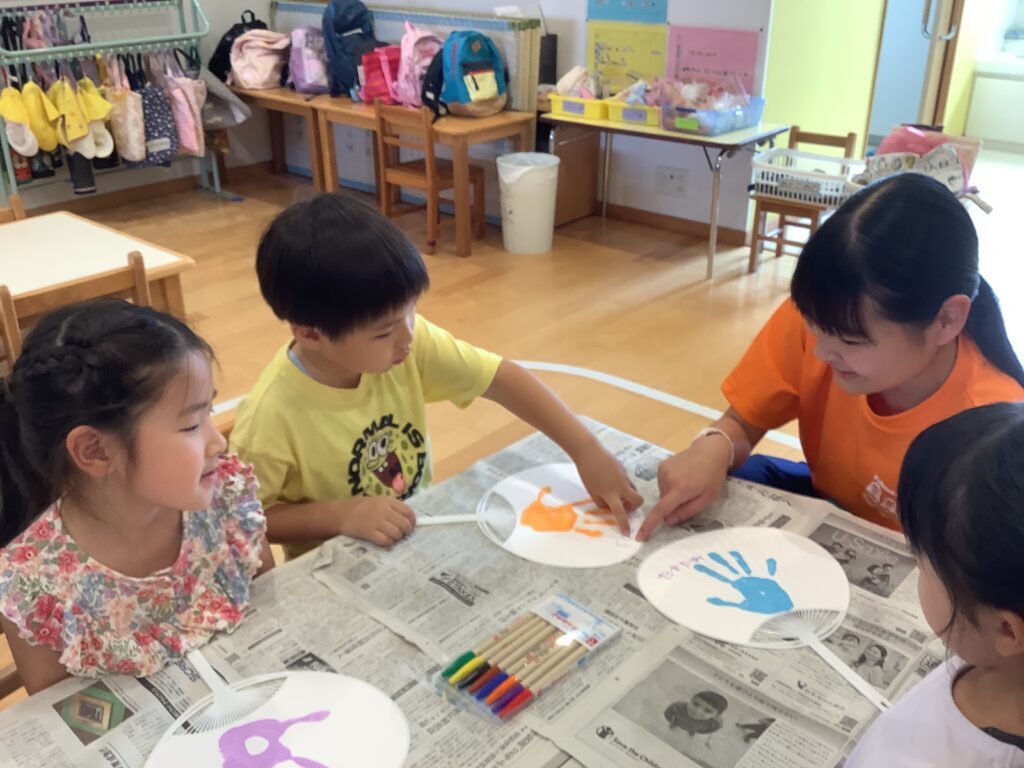 一人ひとり手形を取り、スタンプを押したり、文字を書いたり、おたのしみ保育記念のうちわを作ります。