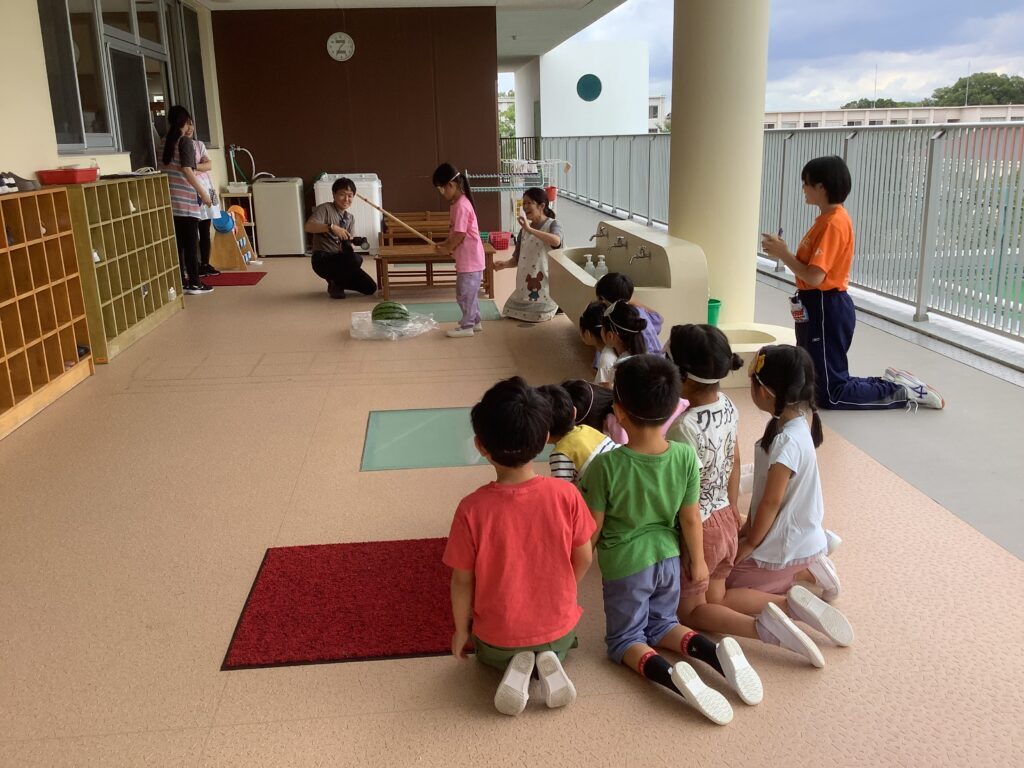 「右、右!左、左!!」目隠しをしているお友達にヒントを出し、クラスの皆で力を合わせて大きなすいかを割ります。