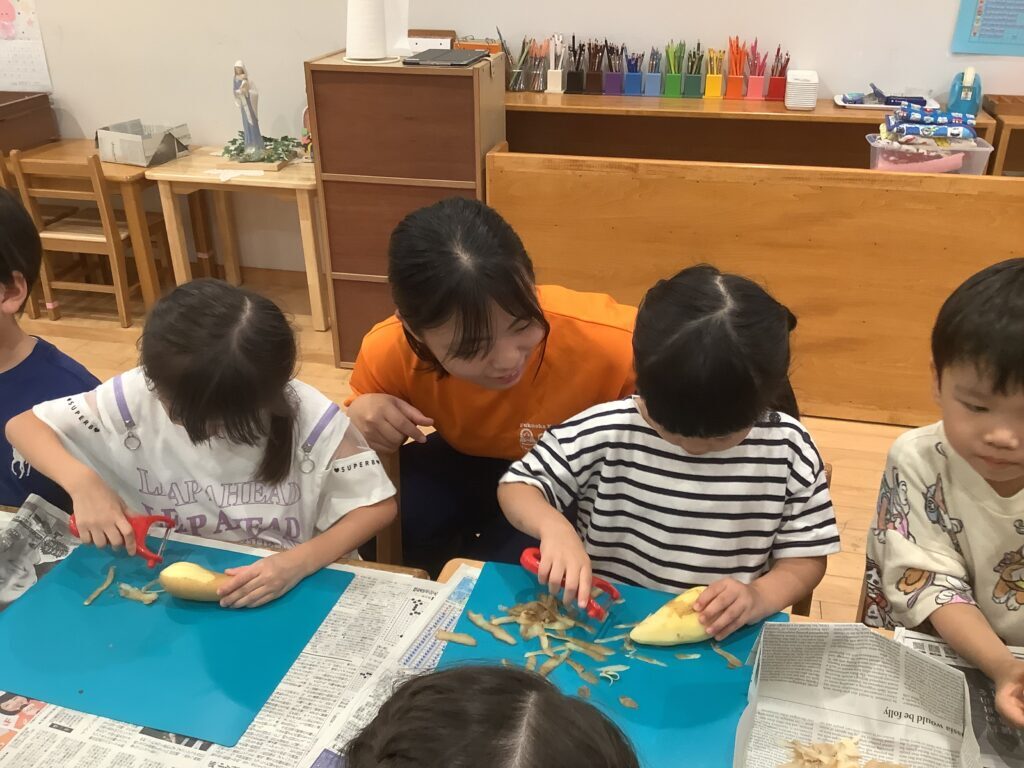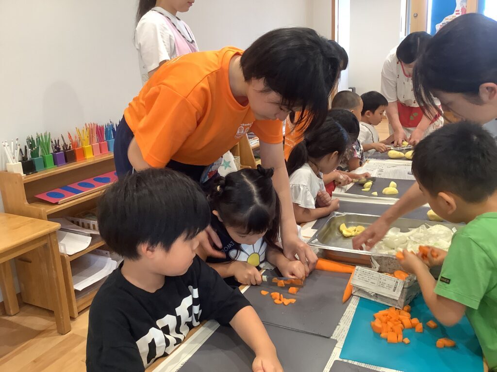 じゃがいもやにんじん、たまねぎ…一人ずつ持ってきた野菜の皮をむき、包丁を使って小さく切ります。初めて包丁を使う子どももいるので、手を切らないように、食べやすい大きさに切れるように援助します。